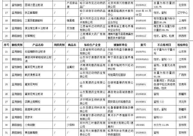 the ministry of agriculture has requested that the two companies focus on the monitoring of the two enterprises and punish enterprises that involve 19 batches of substandard products. it is understood that many of these 144 unqualified products are well-known brands in the industry. in recent days, the ministry of agriculture announced the quality supervision and sampling of veterinary drugs in the fourth period of 2016. it is understood that 144 batches of unqualified veterinary drugs and biological products were investigated in the third quarter. overall, in the third quarter of 2016, a total of 179 batches of animal biological products were inspected, 178 batches qualified, unqualified 1 batch (annex 1), and the qualified rate was 99.4 percent. a total of 3,622 batches of veterinary drugs and chinese veterinary drugs were completed, and 34,79 approved batches were qualified. 143 batches were not qualified (annex 2, annex 3), and the qualified rate was 96.0%. among them, veterinary drug monitoring and sampling 2580 batches, qualified 2478 batches, qualified rate 96.0%; veterinary drug tracking 505 batches, qualified 482 batches, qualified rate 95.4%; veterinary drug targeted sampling 76 batches, qualified 76 batches, qualified rate 100.0%; veterinary drug identification 461 batches, qualified 443 batches, qualified rate of 96.1%. in addition, the ministry of agriculture also according to the key monitoring enterprise division principle, decides the following two enterprises as the key monitoring enterprises. (1) fuyang branch of shanghai shenguang animal health products co., ltd. (2 batches below 50%); (2) guangxi hepu hongxiang animal pharmaceutical co., ltd. (2 batches below 50%). report of the ministry of agriculture on the quality supervision of veterinary drug quality in the fourth period of 2016 the animal husbandry and veterinary services (bureaus, commissions and offices) of the provinces, autonomous regions and municipalities directly under the central government (bureaus, commissions, offices), xinjiang production and construction corps animal husbandry and veterinary services: the quality of veterinary drug quality supervision in the third quarter of 2016 is reported as follows. 1. basic information (1) animal biopsies in the third quarter of 2016, a total of 179 batches of animal biological products were inspected, 178 batches qualified, unqualified 1 batch (annex 1), and the qualified rate was 99.4 percent. (2) sampling of veterinary drugs and veterinary drugs in the third quarter of 2016 has accomplished in the veterinary chemicals, veterinary drug supervision and sampling, 3622, 3479 batches of qualified and unqualified batch (annex 2 and annex 3), 143 qualified rate 96.0%, than the second quarter of 2016 (97.3%) fell 1.3%, (95.3%) than the same period in 2015 increased by 95.3%. among them, veterinary drug monitoring and sampling 2580 batches, qualified 2478 batches, qualified rate 96.0%; veterinary drug tracking 505 batches, qualified 482 batches, qualified rate 95.4%; veterinary drug targeted sampling 76 batches, qualified 76 batches, qualified rate 100.0%; veterinary drug identification 461 batches, qualified 443 batches, qualified rate of 96.1%. from the sampling inspection process, 645 batches were detected in the production section, 632 batches qualified, and the qualified rate was 98.0%, a decrease of 0.5 percentage points from the second quarter of 2016 (98.5%). in the second quarter of 2016, the total of 2,450 batches and 2,339 approved batches was up to 95.5%, which was 1.4 percentage points lower than the second quarter of 2016 (96.9%). with 527 batches and 508 batches, the qualified rate was 96.4 percent, down 1.3 percentage points from the second quarter of 2016 (97.7 percent). in terms of product category, 1439 batches of pharmaceutical products were detected and 1384 qualified. the qualified rate was 96.2%, which was 1.7 percentage points lower than the second quarter of 2016 (97.9%). in total, 1271 batches of antibiotic products were detected and 1236 approved. the qualified rate was 97.3%, down 0.3 percentage points from the second quarter of 2016 (97.6%). a total of 883 batches of tcm products were collected and 830 approved. the qualified rate was 94.0%, 1.7 percentage points lower than the second quarter of 2016 (95.7%). 29 batches of other products were detected, 29 batches qualified and 100.0% of qualified rate. in the third quarter of 2016, the veterinary drug test product related information, please go to the "china veterinary medicine information network" "national veterinary medicine basic information inquiry system" inspection. ii. key monitoring enterprises according to the key monitoring enterprise division principle, the following two enterprises are judged to be the key monitoring enterprises. (1) fuyang branch of shanghai shenguang animal health products co., ltd. (2 batches below 50%); (2) guangxi hepu hongxiang animal pharmaceutical co., ltd. (2 batches below 50%). 3. main problems existing in the third quarter of 2016, the non-conformance of veterinary drug testing was not qualified, and the content of some products was low, the content of individual products was even 0, and the content of individual products was not determined. 4. work requirements (1) implement the provisions for heavier punishment all localities shall, in accordance with the provisions of the ministry of agriculture's public notice no. 2071, comply with the provisions of the provisions of the provisions of the provisions of the ministry of agriculture (annex 4), and shall be given a heavier punishment according to law. if the license for the cancellation of veterinary drugs is revoked, the license for production of veterinary drugs shall be revoked and the penalty shall be imposed. to identify test unqualified, the inspection agency to further test, confirm whether there is a change agent formula, illegal adding other ingredient, such as illegal behavior, to provide