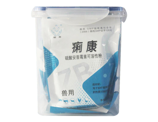 【 main ingredient 】 the sulfuric acid ampucin. 【 traits 】 this product is tan powder. 【 pharmacology 】 (1) the pharmacodynamics for a variety of gram-negative bacteria (e.g., escherichia coli disease, false single spore bacillus, salmonella, klebsiella, proteus, pasteurella, swine dysentery treponema, bronchitis po generation bacterium) and staphylococcus and mycoplasma bactericidal activity. pyridoxal hydrochloride can strengthen the antibacterial activity of this product. apragaz toxin unique chemical structure can fight by multiple plasmids encoding passivation enzyme inactivated effect, thus gram-negative bacteria less resistant to its, many isolated from animal pathogenic escherichia coli and salmonella is sensitive to the illness. apycin and other aminoglycosides do not have cross-drug resistance caused by chromosomal mutations. it is mainly used to treat escherichia coli and other sensitive bacteria. it is also used to treat diarrhoea caused by bacillus calves and salmonella. e. coli, salmonella and mycoplasma infection are also effective. (2) the internal medicine of pharmacokinetics is partially absorbed (especially newborn animals), the absorption amount is related to the dosage, and decreases with the increase of the animal's age. the drug is excreted in its original form through the kidneys. the half-life of calves, sheep, rabbits and chickens are 4.4, 1.5, 0.8 and 1.7 hours respectively. [action mechanism] interferes with the synthesis of bacterial proteins. specifically, it interferes with the synthesis of prokaryotic proteins and inhibits harmful bacteria in animals and treats diseases caused by e. coli and salmonella. by inhibiting the proliferation of e. coli, improving the structure of the intestinal mucosa, promote the body's endocrine activities related to the growth (growth hormone adjustment, membrane island element) and t3 level of synergy and promote animal growth, improve feed utilization rate. [drug interactions] 1. synergistic effect with penicillin or cephalosporin. 2. the antibacterial effect of this class of drugs in alkaline environment is enhanced, and the combination with alkaline drugs can enhance the effectiveness of antimicrobial activity, but the toxicity also increases accordingly. when ph is over 8.4, the antibacterial effect weakens. 3. ca2 , mg2 , na , nh4 , k and other cation can inhibit the antimicrobial activity of the drug. the concentration of these cationic ions should be noted in the culture medium. 4. combined with cephalosporin, dextran, diuretic and erythromycin, it can enhance the ear toxicity of these drugs. 5. skeletal muscle relaxants or drugs with this effect can enhance the neuromuscular retardation of the drug. [indications] used to treat intestinal infection caused by gram-negative bacteria. dosage: 125mg(1, 250, 000 units) per kilogram of weight, seven days of continuous drinking. poultry: a solution of 250mg (250, 000 units) of ampulamycin is prepared to prevent continuous drinking of drinking water for three days for a course of treatment. piglets prevention: as drug type feed premix during the suckling pig is recommended to use methods: 1. the piglets born 1-3 days, using soluble powder shechun soluble in water, every day at 12.5 mg/kg body weight (12500 units) for three consecutive days. 2. use the total period of 7 days -15 kg of suckling pig material and add 90 grams (0.9 billion units)/ton of feed. 3. if you would like to save cost: in addition to press 1 method used, can be used in whole period in the second stage suckling pig feed, feed add 90 grams (090 million units)/ton, poor environment, can be added to 165 grams (165 million units)/tons, from the age of 22 to 35 days of age stage use, also can be used to 42 days of age. meat chicken: 5 grams (5 million units) of feed per 1000kg of feed is added to feed, and the use of full-length in 0-6 weeks will promote the growth of broiler chickens. premix: the concentration of 80-165 g (0.8-165 million units) per 100okg feed is added to pig feed for seven days. [note] 1. drinking water must be prepared in the same day. 2. this product can be invalidated by rust, and the water system should be protected against rust. do not mix with trace element supplements. [period] pig 21, chicken 7, egg production period is disabled. [specification] 100g: apycin 50g(50 million units) package: 100g/package x 10 pack/pail x 8 pail. storage: shade, airtight, preserved in dry place.