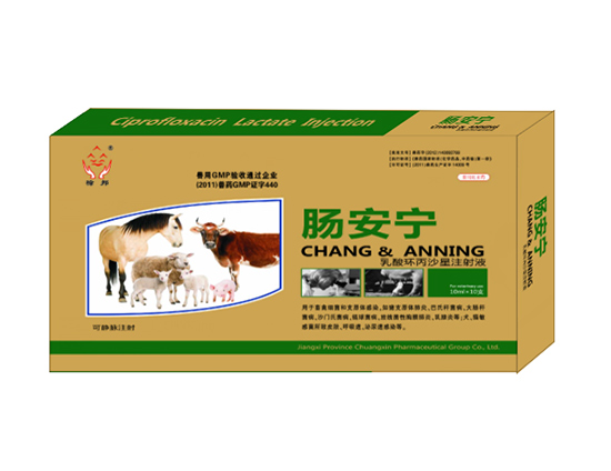 [veterinary drug name] generic name: lactate ciprofloxacin injection ciprofloxacin lactate injection chinese pinyin: rusuan huanbingsheye [main ingredient] lactate ciprofloxacin. 【 traits 】 this product is colorless to pale yellow transparent liquid. 【 pharmacological action 】 the antibacterial spectrum is wide, the bactericidal force is strong, the action is quick. this product is integrated with other synergistic agents and antivirals, and has obvious antibacterial effect on gram-negative and positive bacteria and mycoplasma. the mechanism of action is to antagonize the bacteria's dual-strand dna rotatase, which blocks the replication of bacterial dna and shows a significant effect of rapid sterilization and rapid elimination of intestinal toxins. it is an effective compound preparation for intestinal diarrhea, enteritis and abdominal distention caused by many pathogenic bacteria and viruses. [indications] pigs, cattle, sheep, horses, dogs, rabbits, birds and other animals: 1. dysentery, enteritis, intractable diarrhea, piglet red and white dysentery, paratyphoid. 2. severe diarrhea, diarrhea and chronic diarrhea caused by bacteria, virus, etc. [usage dosage] internal medicine: suckling pig is the best medicine for internal medicine. intramuscular or intravenous administration: one dose, 0.05 to 0.08ml per 1kg weight, 1 time a day, and 2 or 3 days in severe illness. [adverse reaction] a few animals have vomited reaction, stop and disappear spontaneously. [note] 1. when intravenous injection, dilute with saline or glucose injection 2. the concentration of this product is high. if the product is crystallized by cold precipitation, it will be cooled to the temperature after being dissolved, which will not affect the pharmacodynamic effect. [the drug period] 28. [specification] 10ml:0.5g packaging: 10ml x 10 / box. 【 storage 】 shading, seal preservation.