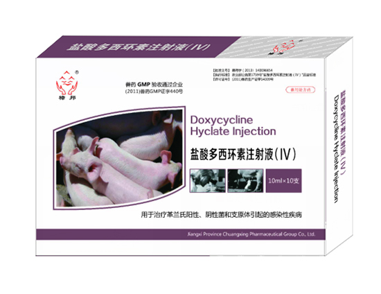 generic name: doxycycline hydrochloride (iv) injection english name: doxycycline hyclate injection pinyin: yansuan duoxihuansu zhusheye 【 main ingredient 】 hydrochloric acid doxycycline 【 traits 】 the product is yellow to brown yellow transparent liquid [pharmacological action] tetracycline antibiotics. doxycycline through reversible with receptors on the bacterial ribosome 30 s subunit, dry trna and mrna ribosome complex formation, prevent the peptide chain extension and inhibition of protein synthesis, so that the growth of bacteria quickly suppressed. doxycycline has inhibitory effect on gram-positive bacteria and negative bacteria, and it has cross - resistance with doxycycline and aureomycin. [indications] used to treat infectious diseases caused by gram-positive, negative bacteria and mycoplasma. : 1. the attached red cell body disease of cattle fever 41 ℃ or so, pale skin and mucosa, yellow gangrene, anemia, anorexia, unresponsive, diarrhea, red urine, sow without milk, conception rate is low, no heat, miscarriage and stillbirth and other symptoms. 2. toxoplasmosis: developing livestock increased body temperature to 41 ℃ ~ 42 ℃, continued fever, waste no appetite, cough, difficulty breathing, nasal fluid, swollen lymph nodes, skin redness and other symptoms. 3. streptococcus disease: livestock high fever, asthma, tears, ataxia, claudication, loss of appetite, like water, spirit is depressed, edema, swollen lymph nodes, eye conjunctiva flush, a speck, rhinoscope flow drying, serous disease, such as nasal juice secondary meningitis, septicemia, arthritis, endocarditis, etc. 4. infection and mixed infection of the above cases and effectively eliminate the infection of caramella, plowworm, and trypanosomal infection. [usage and dosage] intramuscular injection: 1ml (0.1ml/kg) per 10kg of weight at a time, usually a single injection, once a day, the critically ill animals are injected 24 hours later. intramuscular injection can cause pain, inflammation and necrosis in the injection site. 2. doxycycline has certain hepatic and renal toxicity, which can cause severe liver damage and can be seen occasionally. [note] 1. severe injury of liver and kidney function is used carefully. 2. since the drug is easy to penetrate through the placenta and into milk, the pregnant and lactating animals are disabled. 1. combined with sulfonamide in the treatment of toxoplasma infection. 2. the large dosage should be injected, and the duration of treatment should be extended appropriately. the pig is 28 days old. [specification] 10ml:1g 10mlx10 / box storage: kept in a cool dark place. [approval number] veterinary drug (2013) 140096654 [implementation criteria] department of agriculture no. 1459, the quality standard of "polyciliocycline hydrochloride injection (iv)" [license number] (2011) veterinary drug production certificate 14009