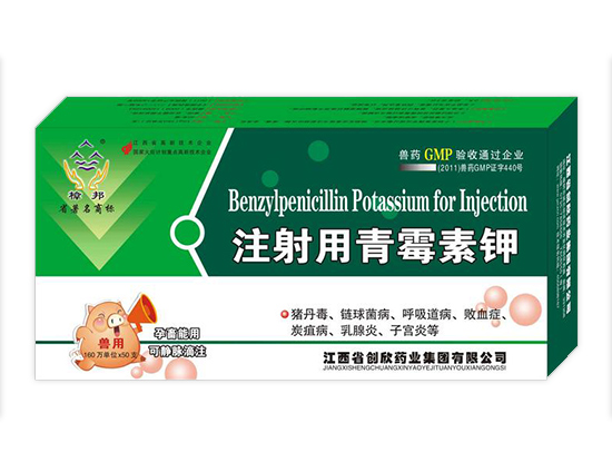 high fever, swine erythromycosis, streptococcus disease, anthracnose, actinomycosis, necrosis bacillus, pyelonephritis, mastitis, hysteritis, pneumonia, septicaemia, etc. [main ingredient] penicillin potassium. antibiotic drugs. the clinical application is wide and safe. it is mainly used for gram positive bacteria cause of infectious diseases, such as swine erysipelas, streptococcus disease, anthrax, actinomycosis, necrosis bacillus disease, pyelonephritis, mastitis, metritis, pneumonia, sepsis, etc. also used in leptospirosis. [usage dosage] intramuscular injection or intravenous drip: at one time, per kg weight: horses, cattle 1 ~ 20, 000 units; sheep, pigs, colts, calves, 2 ~ 30, 000 units; dog, cat 3 ~ 40 thousand units, bird 50,000 units. 2 ~ 3 times a day, 2 ~ 3 days. the injection water is used to inject water to dissolve. [gauge] 1.0g (1.6 million units)/branch [package] 50 pieces/box [storage] sealed in a cool and dark dry place.