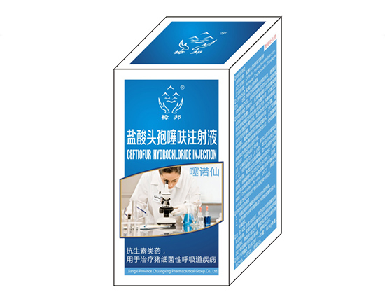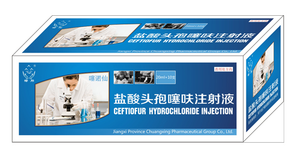 ceftiazurate hydrochloride injection [veterinary drug name] generic name: ceftiazi hydrochloride injection with prescription drugs english name: ceftiofur hydrochloride injection chinese pinyin: yansuan toubaosaifu zhusheye [main ingredients] cefotiroxine hydrochloride 【 traits 】 this product is a fine suspension of fine particles, and after static, the fine particles sink, and then the soft and white suspension is formed. [pharmacological action] pharmacodynamics cephalosporins thiamethoxam cefuroxime is cephalosporin class of veterinary clinical antibiotics, has a broad spectrum bactericidal effect, to gram-positive bacteria and gram-negative bacteria (including beta lactamase bacteria () have strong antibacterial activity. such as bacilli pasteurium, hemolytic pasteurium, pleural pneumoniae, salmonella, streptococcus, staphylococcus, etc. ceftiazurazone is used to block the synthesis of the peptides, which causes the bacterial cell wall to be sterile and sterilization. the internal medicine of pharmacokinetics is not absorbed and the intramuscular injection is absorbed quickly, and the peak time is about 1.8 hours. this product is widely distributed in the body, but cannot penetrate the blood-brain barrier. the drug concentration in blood and tissues was high, and the concentration of effective blood drug was prolonged, and the half-life was long (t1/2 was about 20.3 hours). in vivo, the active metabolite deoxyfuran ceftiofur (dfc) can be produced and further metabolized into inactive products excreted from urine and feces. [drug interactions] 1. synergistic effect with glucosaminoglycoside. 2. in combination with propysulfonate, it can improve the concentration of drug and prolong the half-life antibiotics are used to treat bacterial respiratory diseases. the effects of the intestinal and respiratory diseases, environmental changes, weaning stress and the decrease of maternal antibody in the comprehensive prevention of bacterial bacterial infection can improve the survival rate of piglets. [usage and dosage] intramuscular injection: at one time, each 1kg weight, pig 5mg. one time a day, three days. health care method: weaning or introduction of 1 day, 7 days, 1ml of intramuscular injection. [adverse reactions] 1. may cause gastrointestinal flora disorder or secondary infection. 2. have certain renal toxicity 3. in cattle, it can cause characteristic depilation and itching. 1. shake well before use; not to be frozen; after the first use, it should be used within 14 days. 2. the dosage should be adjusted for the renal insufficiency. 3. those who are sensitive to beta-lactamase should avoid contact with this product and avoid contact with children. pig 4 days [specification] 20ml:1g 20ml x 10 pieces/box storage: shade, sealed and preserved.