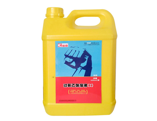 [veterinary drug name] name: peroxyacetic acid solution (i) business name: epidemic prevention peracetic acid solution (i) chinese pinyin: guoyangyisuan rongye (i) 【 main ingredients 】 peroxyacetic acid 【 traits 】 this product is colorless to pale yellow transparent liquid, has strong irritating odor, volatile, is easy to decompose, has corrosive, encountered organic matter or metal is quick decomposition. [pharmacological action]. this product is a strong oxidizing agent, and it is used to destroy pathogenic microorganisms by releasing the initial ecological oxygen. [use] used to kill the bacteria, spores, fungi and viruses of stables, utensils, clothing, etc. [usage dosage] in this product meter. spray sterilization: 1:20 ~ 400 times dilution of livestock and poultry stall; fumigation: 5 ~ 15ml per cubic meter of livestock and poultry stall; soak and disinfect: livestock and poultry food, staff clothing, arms, etc. : 500% dilution; drinking water disinfection: every 10l of water plus this product 1ml. the steam of this product is irritating to the mucosa. 1. this product is highly corrosive, wear protective gloves when operating, and avoid the skin of medicine. 2. avoid metal appliances when dilution. 3. the solution should be cool, light-resistant, sealed and sealed in a glass bottle or in a hard plastic bottle. there is no standard requirement. [specifications] 16.0% ~ 23.0% (g/ml) packaging: 5000ml/bottle [storage] in a solid corrosion resistant container, the casing of various packing containers should be covered with air vent but no leakage of liquid material. keep in a cool dark place. don't put the upside down.