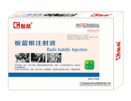 quality guarantee of national standard no drug residue was found in pure chinese medicine preparations treatment of postpartum lactation, lactation, lactation, milk carbuncle postpartum blood loss, deficiency, nourishing qi and blood, emulsion block, etc name of veterinary drug: root injection injectio radix isatidis chinese pinyin: banlangen zhusheye 【 main ingredients 】 the blue root. 【 character 】 this product is brown clear sterilization solution. attending function 】 【 this product for less labor sow postpartum milk, milk, milk carbuncle and a variety of traditional chinese medicine composition aggregation (astragalus membranaceus, cowherb seed, chinese honeylocust spine, chinese angelica, codonopsis, rhizoma ligustici wallichii, pangolin scales, passepartout, etc.). it is beneficial to nourish and nourish the blood and reduce the milk. by activating the pituitary gland and mammary gland, the secretion of prolactin can be promoted, producing milk and unimpeded mammary gland, thereby providing the function of lactation and lactation. mainly used in: 1. no milk, no milk, no milk: the mother's breast is dried and loose, and the artificial milking can not be squeezed out, or the milk water is as thin as water. 2. treatment of postpartum blood loss, deficiency of body, nourishing qi and blood, milk and vaginal hysteresis, milk carbuncle, etc. 【 usage and dosage 】 intramuscular or intravenous injection: a quantity, horses, cattle 20 ~ 40 ml, sheep, pigs, 10 to 20 ml, dog, cat, rabbit, fox, raccoon, deer and other small animals 2 ~ 5 ml, 1 times a day, a laparoscope, usually connected to a severe 2 ~ 3 days. oral clothes: once, horses, cattle 40 ~ 60ml, sheep, pig 20 ~ 40ml, dog, cat, rabbit, fox, raccoon deer 5 ~ 10ml. tips: this product can be used three days before the birth of the mother. there is no regulation. [caution] for the storage of chinese medicine preparations, if there are a few chromatic aberrations or precipitation precipitation, shake well use, the effect is equivalent. [expert tips]. oral administration of the product or feeding of the "anti-inflammatories" is a good result. to strengthen the daily feed and succulent green feed of sows. use a warm towel to massage your breasts before and after childbirth. there is no regulation. [specification] 10ml is equivalent to 5g of original medicine packaging: 10ml x 10 / box. storage: avoid light preservation.