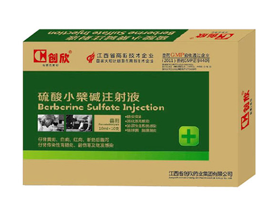 [main ingredients] berberine sulfate. 【 traits 】 this product is yellow transparent liquid. [indications] apply to infection or mixed infection caused by various sensitive bacteria: 1. piglet yellow dysentery, dysentery, red dysentery, watery diarrhea, diarrhea after weaning; 2. intestinal infection of piglets infectious gastroenteritis and bacterial dysentery; 3. streptococcus suis disease, edema, paratyphoid and secondary infection; 4. diarrhea and diarrhea of young animals, such as lambs, calves, foals, etc. [usage dosage] intramuscular injection: one dose, 7 days old suckling pig 0.3 ~ 0.5ml/head; weight of 1kg for every 1kg of piglets for 7 days of age; usually injected 1 time, the second day of the intensive care 1; adult livestock cattle, horses, sheep and pigs each 1kg weight 0.1ml. there is no regulation. [note:] this product has a unique effect and is not required to be used in conjunction with other drugs in the treatment of these diseases. don't overuse it. don't give the medicine an intravenous injection. in cold precipitate crystallization, the former immersion in hot water, the hard shake, dissolved into a clear liquid and cool to the temperature. the pig is 28 days old. specification: 10ml: 0.2 g. packaging: 10ml x 10 / box storage: avoid light and seal preservation.