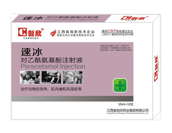 name of veterinary drug: acetaminophen injection english: paracetamol injection chinese pinyin: duiyixian 'anjifen zhusheye [major components] acetaminophen. 【 traits 】 this product is colorless or almost colorless and slightly sticky. [pharmacological action] relieve heat, analgesia, antiphlogistic drug. by inhibiting the anterior part of the thalamus, the prostaglandin e(pge) is synthesized and released, which can restore normal reaction of the body heat and heat, and restore normal body temperature. it can also inhibit the synthesis and release of prostaglandin in local inflammatory tissues, and it can relieve inflammation and pain. this product is composed of various kinds of heat, analgesic and anti-inflammatory ingredients. it has a remarkable clinical effect, which can be effective in a few minutes. its effect is 2 ~ 2.5 times stronger than indole and is 26 ~ 50 times stronger than aspirin. [indications] used for animals such as horses, cows, pigs, sheep, dogs, rabbits, birds and other animals: 1. high fever high fever: all sorts of bacteria, viruses, mycoplasma, toxoplasma gondii, attached to the red cell body disease and its mixed infection caused by high fever, elasticity, repeatability, high fever, popular hot, continued fever, postpartum heat and unknown high fever, etc. 2. arthritis and rheumatism: acute and chronic inflammation, such as rheumatoid arthritis, non-articular rheumatism, myitis and soft tissue inflammation. 3. pain: muscle pain, joint pain, neuralgia, trauma and post-operative inflammatory pain and swelling, postpartum pain, ear, throat inflammatory pain, etc. 4. claudication: caused by acute rheumatoid arthritis, severe pain in the waist, unstable gait, or even standing up. [usage and dosage] intramuscular injection: at one time, every 1kg weight, horse, ox, 0.05 ~ 0.08 ml, pig, sheep, donkey, deer, dog 0.08 ~ 0.1 ml, intensive 2 ~ 3 days. [adverse reactions] i saw nausea, vomiting, and recovered after stopping. [caution] 1. the cat is banned. 2. the high fever caused by bacterial infection, combined with antibiotic use, is more effective. there is no regulation. [specification] 10ml: 1g packaging: 10ml x 10 / box storage: shade, sealed and preserved