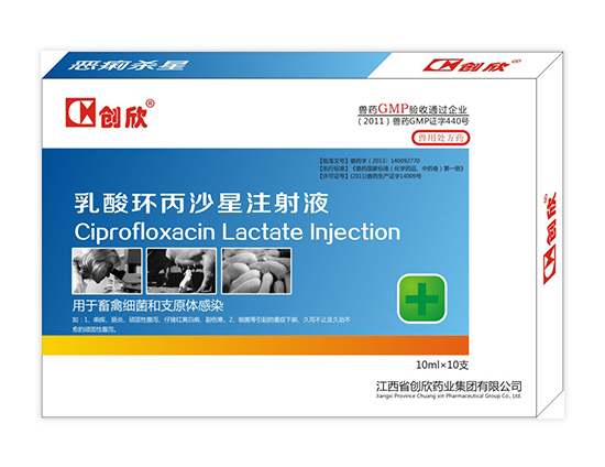 pregnant animals can be injected intravenously swine dysentery, enteritis, piglet red, yellow and white dysentery, paratyphoid severe diarrhea, chronic diarrhea, and chronic diseases name of veterinary drug: lactate ciprofloxacin injection ciprofloxacin lactate injection chinese pinyin: rusuan huanbingsheye [main ingredient] lactate ciprofloxacin (c17h18fn303 · c3h6o3) 【 traits 】 this product is colorless to pale yellow transparent liquid. 【 pharmacological action 】 the antibacterial spectrum is wide, the bactericidal force is strong, the action is quick. this product is integrated with other synergistic agents and antivirals, and has obvious antibacterial effect on gram-negative and positive bacteria and mycoplasma. the mechanism of action is to antagonize the bacteria's dual-strand dna rotatase, which blocks the replication of bacterial dna and shows a significant effect of rapid sterilization and rapid elimination of intestinal toxins. it is an effective compound preparation for intestinal diarrhea, enteritis and abdominal distention caused by many pathogenic bacteria and viruses. [indications] pigs, cattle, sheep, horses, dogs, rabbits, birds and other animals: 1. dysentery, enteritis, intractable diarrhea, piglet red and white dysentery, paratyphoid. 2. severe diarrhea, diarrhea and chronic diarrhea caused by bacteria, virus, etc. [usage dosage] internal medicine: suckling pig is the best medicine for internal medicine. intramuscular or intravenous administration: one dose, 0.05 to 0.08ml per 1kg weight, 1 time a day, and 2 or 3 days in severe illness. [adverse reaction] a few animals have vomited reaction, stop and disappear spontaneously. [note] 1. when intravenous injection, dilute with saline or glucose injection 2. the concentration of this product is high. if the product is crystallized by cold precipitation, it will be cooled to the temperature after being dissolved, which will not affect the pharmacodynamic effect. [the drug period] 28. [specification] 10ml: ciprofloxacin 1g packaging: 10ml x 10 / box. storage: shade, sealed and preserved.