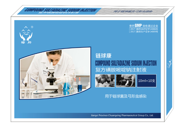 generic name: compound sulfadiazine sodium injection compound sulfadiazine sodium injection chinese pinyin: fufang huang'anmidingna zhusheye 【 main components 】 sulfadiazine sodium, methoxybenzine 【 character 】 this product is colorless to the microyellow transparent liquid. [pharmacological action] this product is a broad-spectrum antibacterial agent, which is effective for most gram-positive bacteria and some gram-negative bacteria, and also effective for the coccidiasis and toxoplasma. sulfadiazine acts on dihydrofolate synthase, which interferes with the first step of folate synthesis. methoxyl benzyl totally belong to antibacterial synergist, folic acid acts on the synthesis of the second step, selective inhibition dihydrofolate reductase role, so the two together can produce synergy, can make the bacteria folic acid metabolism by double block, enhanced antibacterial effect. the effects of sulfa drugs can be metabolized into drugs such as procaine and tetracaine. in addition, the abscess and tissue decomposition products can also provide the necessary substances for bacterial growth and antagonize the sulfonamide drugs. [drug interaction] (1) contains some of acyl amino benzene armour drugs such as procaine, tetracaine can generate the amino acid in the body, such as yeast contains bacteria needed for amino acid metabolism, can reduce the medicine effect, therefore should not be used. (2) the use of diuretics such as thiazine or urinates can aggravate renal toxicity. (3) usually can replacement under high protein binding rate of sulfonamides drugs, such as methotrexate, bute, thiazide diuretic, duly salicylate, probenecid, benzene, although the clinical significance of interaction is not entirely clear, but must be replacement drugs to strengthen monitoring. (4) the combination of antacids and sulfonamides can reduce their bioavailability. [function and purpose] sulfonamide antibacterial drugs. used for sensitive bacteria and toxoplasma infection. [usage and dosage] intramuscular injection: one dose, 1kg of weight, livestock 0.2 ~ 0.3ml. 1 ~ 2 times a day, 2 ~ 3 days. [adverse reactions] acute reactions, such as anaphylaxis, are shown to be reduced in granulocytes, thrombocytopenia, liver damage, kidney damage and central neurotoxic reactions. easy to deposit in the urine, long-term or large dosage can cause crystallization urine. (1) this product can be crystallized by acid, so it should not be diluted with 5% glucose. (2) long or large doses of sodium bicarbonate should be applied at the same time, and a large amount of drinking water should be given to the animals. (3) if there is an allergic reaction or any other serious adverse reaction, stop the medicine immediately and give treatment to the symptomatic treatment. [take the medicine period] cattle, sheep 12 days, pigs 20 days; the duration of milk is 48 hours. 【 specification 】 10ml: sulfadiazine sodium 1g methoxybenzyl 0.2g packaging: 10ml x 10 branches storage: shade, sealed and preserved. [implementation standard] "chinese veterinary medicine book" 2005 version 1 [license number] (2017) veterinary drug production certificate 14009