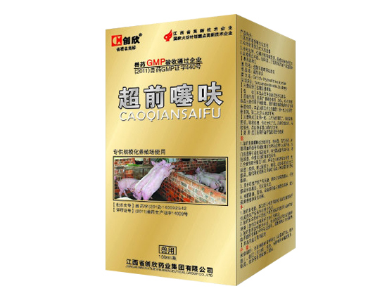 【主要成份】盐酸头孢噻呋。 【适 应 症】适用于治疗畜禽细菌性疾病 猪 1.治疗由胸膜肺炎放线杆菌、链球菌、巴氏杆菌、副猪嗜血杆菌等引起的细菌性呼吸道病和大肠杆菌、沙门氏菌等引起的肠道疾病。特别是副猪嗜血杆菌、猪链球菌、仔猪黄白痢的首选药物。 2.全面预防仔猪黄白痢,呼吸道(副猪嗜血杆菌,链球菌)疾病,防止因剪牙、断尾、去势等所致的伤口感染,降低断奶应激及母源抗体减少等因素对仔猪的影响。 3. 用于母猪产前产后保健,预防母猪尿路感染、子宫感染和乳腺炎、无乳综合症。 4. 预防转群、混群、运输前后猪只细菌性疾病,减少疾病传播和降低应激。 牛 1.治疗由梭菌、革兰氏阴性厌氧菌或化脓性细菌等所引致的牛产后各种类型子宫炎。 2.治疗由坏死梭杆菌或产黑色素拟杆菌所引致的牛腐蹄病(急性趾间坏死杆菌病)和蹄皮炎。 3.治疗由溶血性巴氏杆菌、多杀性巴氏杆菌或昏睡嗜血杆菌所引致的牛呼吸道疾病、细菌性肺炎 和运输热。 【用法用量】肌肉注射 仔 猪 保健目的:全面预防仔猪呼吸道(副嗜血杆菌,链球菌)、肠道(黄白痢)疾病,保护哺乳仔猪因剪牙、断尾、去势等所致的伤口感染。 使用方法:仔猪1日龄、7日龄、2-3周龄分别肌肉注射0.1ml,0.3ml,0.5ml, 治疗时加倍或按治疗用量使用,重症加倍。 外购仔猪 保健目的:全面预防细菌性引起的肠道和呼吸道疾病、降低环境改变、断奶应激及母源抗体减少等因素对仔猪的影响,提高成活率。 使用方法:引进第1天,第7天,第14天分别肌肉注射1ml/头 。 母 猪 母猪配种前24小时内,肌肉注射10ml/头 目的:提高受精率。 母猪产后24小时内,肌肉注射10ml/头 目的:预防母源病原体对小猪的感染及母猪产后无乳症、子宫炎等综合症。 育 肥 猪 保健目的:净化猪群,减少疾病传播和降低应激。 使用方法:换料、转群、混群、运输前后,肌肉注射5ml/头。 发 病 猪 每10kg体重肌肉注射1ml(0.1ml/kg),一日一次,连用2-3天。 牛 子宫炎:每10kg体重肌肉注射0.5ml(0.05ml/kg) ,连用5天 呼吸道疾病:每10kg体重肌肉注射0.3-0.5ml(0.03-0.05ml/kg), 连用3-5天 腐蹄炎:每10kg体重肌肉注射0.3-0.5ml(0.03-0.05ml/kg), 连用3-5天 【规 格】100ml: 5g 【包 装】100ml/瓶