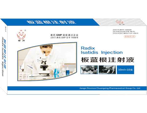 【主要成分】板蓝根。【性 状】本品为棕色澄明灭菌溶液。【功能与主治】抗菌药。用于治疗家畜流感、仔猪白痢、肺炎及某些发热性疾患。【用法用量】肌内注射 一次量:猪、羊10~25m1,马、牛40~80ml【不良反应】暂无规定【注意事项】暂无规定【休 药 期】暂无规定。【规 格】10ml(10ml相当于原生药5g)。【包 装】10 ml×10支【贮 藏】避光,密闭保存。