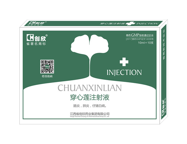 【兽药名称】通 用 名:穿心莲注射液 汉语拼音:chuanxinlian zhusheye 【主要成分】穿心莲内酯2%、苦参碱3%、乳酸环丙沙星5%、甲喹甲酮2%。 【性 状】本品为黄色或黄棕色的澄明液体。 【功能主治】本品溶入苦参碱、穿心莲内酯等成份并与西药精华组合配制而成的复方强效制剂。主要用于猪、羊、牛、马、兔、犬、禽等动物的如下病症。 细菌性腹泻:如仔猪黄白痢、副伤寒、犊牛腹泻、犊牛副伤寒、羔羊痢疾、禽霍乱、雏鸡白痢等。 营养性腹泻:营养过剩或不良性腹泻。 病毒性腹泻:如传染性胃肠炎、肠炎、流行性腹泻、轮状病毒病等。 应激性腹泻:断奶、换料、转群、天气变化、环境不适、外购猪等各种应激引起的腹泻。 细菌、病毒综合引起的重症下痢、血痢、久泻不止及久治不愈的顽固性腹泻。长期或经常使用其它药物,产生耐药而导致效果不佳或无效时,使用本品有独特的效果。 【用法用量】肌肉注射:马、牛每1kg体重0.06ml,羊、猪每1kg体重0.1ml 一般情况下一针即可,严重病例在24小时后补注一针。 内 服:按肌肉注射的倍量用药。 【不良反应】未见不良反应。 【注意事项】1、刚出生的仔猪不宜超量,以内服为佳。1-7日龄仔猪内服可有效预防黄、白痢的发生。 2、中药因产地因素造成少许色泽差异,不影响疗效。 【休 药 期】暂无规定。 【规 格】10ml:原生药10g 【包 装】10mlx10支/盒。 【贮 藏】遮光,密闭保存。