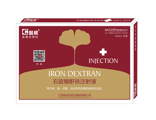 孕畜能用 缺铁、缺钴、缺硒、缺锌性贫血,补充vb12 补铁补血,养血造血,提高幼畜成活率 【兽药名称】通用名:右旋糖酐铁注射液 英文名:iron dextran injection 汉语拼音:youxuantanggan tie zhusheye 【主要成分】右旋糖酐铁钴、vb12、硒、锌。 【性 状】本品为深褐色的胶体溶液。 【药理作用】缺铁性贫血是由于铁的摄入不足或损失过多,而使血红素生成减少。本品在补铁的基础上,融入vb12及钴、硒、锌等微量元素,充分补充。其作用机理系通过药物进入血循环后,结合成血浆铁,转运至肝、脾、髓等组织中,形成血红素及血红蛋白,进而发育成为成熟红细胞,从而显现增进机体造血功能,补充造血,改善贫血状态的显著功效。 【适 应 症】 1、重症缺铁性贫血,如慢性失血、营养不良、传染病、寄生虫等所致的缺铁性贫血或不宜内服铁剂的缺铁性贫血。 2、孕畜、哺乳期仔猪贫血及急、慢性失血性贫血,如仔猪下痢、营养不良、生长迟缓、消瘦、皮炎、后肢运动不协调,母猪受胎率下降等。 3、补充vb12及钴、硒、锌等微量元素,增进机体造血功能。 【用法用量】 肌内注射:一次量,仔猪、羔羊、犊牛、驹1ml,大牲畜3ml,孕畜分娩前建议注射2-3ml。 内 服:一次量,仔猪1-2ml。 【不良反应】暂无规定。 【注意事项】1、严重肝、肾功能减退患畜忌用。 2、肌注时如有局部疼痛,可深部肌注。 【休 药 期】暂无规定。 【规 格】10ml:1g(fe) 【包 装】10mlx10支/盒。
