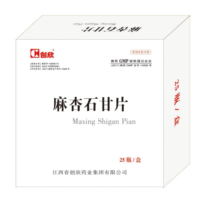 【兽药名称】通用名称:麻杏石甘片 兽用非处方药 汉语拼音:maxing shigan pian 【主要成分】麻黄、苦杏仁、石膏、甘草。 【性状】本品为淡灰黄色片;气微香,味辛、苦、涩。 【功能】清热,宣肺,平喘。 【主治】肺热咳喘。支气管慢呼,支气管炎等。 证见发热有汗或无汗,烦躁不安,咳嗽气粗,口渴尿少,舌红,苔薄白或黄,脉象浮滑而数。 【用法与用量】兔5~10片,兔5~10片,鸡、鸭、鹅3~5片,一日2次,连服2~3天,幼禽½~¼片(视体重而定),预防量减半。。 【不良反应】按规定剂量使用,暂未见不良反应。 【注意事项】暂无规定。 【规格】每1片相当于原生药0.3g。 【包装】60片/瓶×25瓶/盒 【贮藏】密闭,防潮。 |