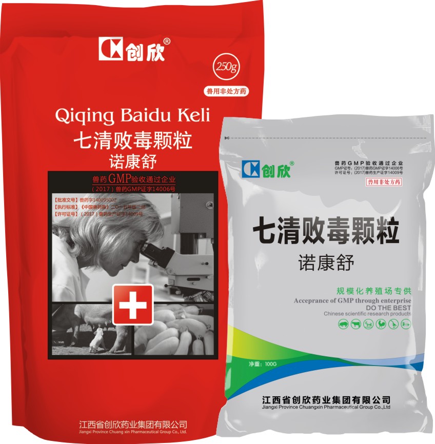 【兽药名称】 通用名称:七清败毒颗粒 汉语拼音:qiqing baidu keli 【主要成分】 黄芩、虎杖、白头翁、苦参、板蓝根等。 【性状】 本品为黄棕色至棕褐色颗粒;味苦。 【功能】 清热解毒,燥湿止泻。 【主治】 湿热泄泻,雏鸡白痢。 证见发热怕冷,精神沉郁,翅膀下垂,食欲减少或废绝,口渴多饮,排白色、淡黄或淡绿色稀粪,粪便粘连在泄殖腔周围。张口呼吸,死亡多在出壳后 2~3 周,3 周龄以上者较少死亡。 【用法与用量】 混饮:每 1l 水,禽 2.5g。 【不良反应】 按规定剂量使用,暂未见不良反应。 【注意事项】 暂无规定。 【规 格】1g相当于原生药1g 【包 装】250g/袋、100g/袋 【贮 藏】密闭,防潮。