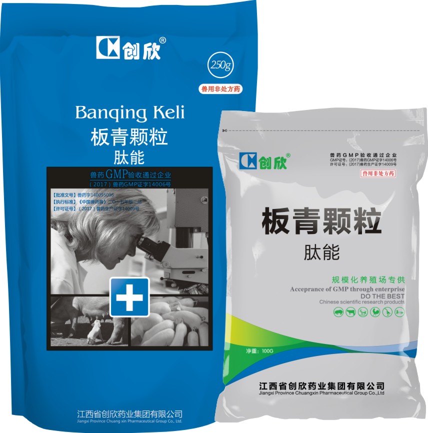 【兽药名称】 通用名称:板青颗粒 汉语拼音:banqing keli 【主要成分】 板蓝根、大青叶。 【性状】 本品为浅黄色或黄褐色颗粒;味甜、微苦。 【功能】 清热解毒,凉血。 【主治】 风热感冒,咽喉肿痛,热病发斑。 风热感冒 证见发热,咽喉肿痛,口干喜饮,苔薄白,脉浮数。 咽喉肿痛 证见伸头直项,吞咽不利,口中流涎。 热病发斑 证见发热,神昏,皮肤黏膜发斑,或有便血、尿血,舌红绛,脉数。 【用法与用量】 马、牛50g;鸡0.5g。 【不良反应】 按规定剂量使用,暂未见不良反应。 【注意事项】 暂无规定。 【规 格】1g相当于原生药1g 【包 装】250g/袋、100g/袋 【贮 藏】密闭,防潮。
