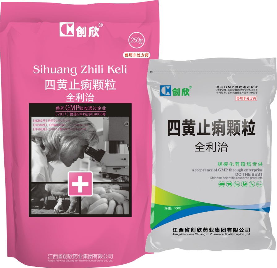 【兽药名称】 通用名称:四黄止痢颗粒 汉语拼音:sihuang zhili keli 【主要成分】 黄连、黄柏、大黄、黄芩、板蓝根等。 【性状】 本品为黄色至棕黄色的颗粒。 【功能】 清热泻火,止痢。 【主治】 湿热泻痢,鸡大肠杆菌病。 证见精神沉郁,食欲不振或废绝,羽毛蓬乱无光泽,头颈部特别是肉垂及眼睛周围水肿,肿胀部位皮下有淡黄色或黄色水样液体,嗉囊充满食物,排淡黄色、灰白色或绿色混有血液的腥臭稀便。 【用法与用量】 混饮:每 1l 水,鸡 0.5~1g。 【不良反应】 按规定剂量使用,暂未见不良反应。 【注意事项】 暂无规定。 【规 格】1g相当于原生药1g 【包 装】250g/袋、100g/袋 【贮 藏】密闭,防潮。