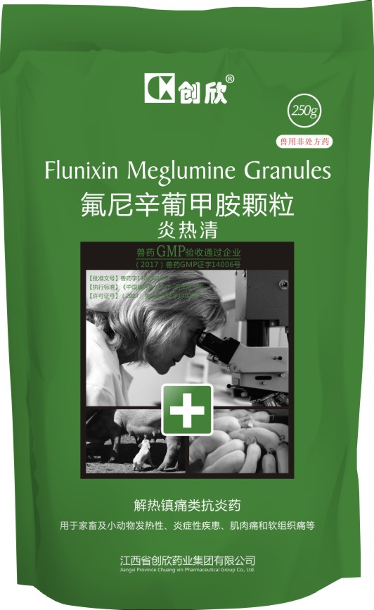 【兽药名称】 通用名称:氟尼辛葡甲胺颗粒 英文名称:flunixin meglumine granules 汉语拼音:funixin pujia,an keli 【主要成分】 氟尼辛葡甲胺 【性状】 本品为类白色或淡黄色颗粒。 【药理作用】药效学 氟尼辛葡甲胺是一种强效氧化酶抑制剂,具有镇痛、解热、抗炎和抗风湿作用。镇痛作用是通过抑制外周的前列腺素或其痛觉增敏物质的合成或它们的共同作用,从而阻断痛觉冲动传导所致。外周组织的抗炎作用可能是通过抑制环氧化酶、减少前列腺素全体物质形成,以及抑制其他介质引起局部炎症反应所致。氟尼辛葡甲胺不影响马的胃肠道蠕动,但可能能改善败血性休克动物的血液动力学。 药动学 猪单次肌内注射给药后(2.2mg/kg体重),血浆消除半衰期为3~4小时,达峰浓度为2.94μg/ml,达峰时间为0.4小时,给药18小时后仍可在血液中检测到药物。表观分布容积为2.0l/kg,单次颈部注射的生物利用度为87%。 【药物相互作用】⑴与其他非甾体类抗炎药同时使用,会加重对胃肠道的毒副作用,如溃疡、出血等。 ⑵因血浆蛋白结合率高,与其他药物联合应用时,氟尼辛葡甲胺可能置换与血浆蛋白结合的其他药物或者自身被其他药物所置换,以致被置换的药物作用增强,甚至产生毒性。 【作用与用途】解热镇痛类抗炎药。用于家畜及小动物发热性、炎症性疾患、肌肉痛和软组织痛等。 【用法与用量】以本品计。内服:一次量,每1kg体重,犬、猫40mg,一日1~2次,连用不超过5日。 【不良反应】长期大剂量使用本品可能导致动物胃溃疡及肾功能损伤。 【注意事项】⑴消化道溃疡患畜慎用。 ⑵勿与其他非甾体类抗炎药同时使用。 【休药期】无需规定。 【规格】按c14h11f3n2o2计5% 【包装】250g/袋 【贮藏】遮光,密闭保存。 |