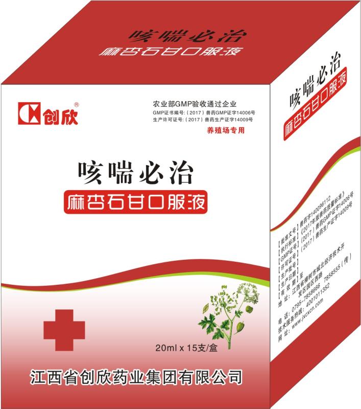 咳喘必治 【兽药名称】通用名称:麻杏石甘口服液 兽用非处方药 汉语拼音:maxingshigan koufuye 【性状】本品为红棕色的澄明液体。 【主要成分】麻黄、苦杏仁、防风、甘草、金银花、黄芩、陈皮等。 【功能主治】清热解毒,清肺平喘,化痰止咳,消炎利咽,开胃消食,泻火通便。 1. 用于马、牛、羊、猪等家畜因采食干草引起的热症,咳嗽,喘气,咽喉肿痛,目赤肿痛,流黄脓或带血鼻涕,慢草不食,食滞不化,胃肠胀气,厌食,咽干呛咳,尿黄短少,脘腹胀满,消化不良,发寒呕吐,鼻镜干燥,毛粗皮癞。 2. 用于牛羊等家畜外感风寒,流行性感冒,传染性胸膜炎,支气管炎,吸入刺激性气体等引起的咽喉肿痛,咳嗽气喘及各种病毒性疾病引起的肺部感染和呼吸系统综合症。 【用法用量】口服。大家畜0.1~0.2ml/kg,小家畜0.2~0.4ml/kg。 【不良反应】暂无规定。 【注意事项】1.在用前控制饮水3~4小时后再将药液加入饮水中,使家畜将药液充分饮入; 2.用于四季泻火; 3.本品有轻微沉淀属正常现象,摇匀后使用不影响疗效。 【规格】每1ml相当于原生药2.4g。 【包装】20ml×15支 【贮藏】遮光,密闭保存。 【批准文号】兽药字140096112 【执行标准】《2017年版兽药质量标准》 【gmp证号】(2017)兽药gmp证字14006号 【许可证号】(2017)兽药生产证字14009号 |