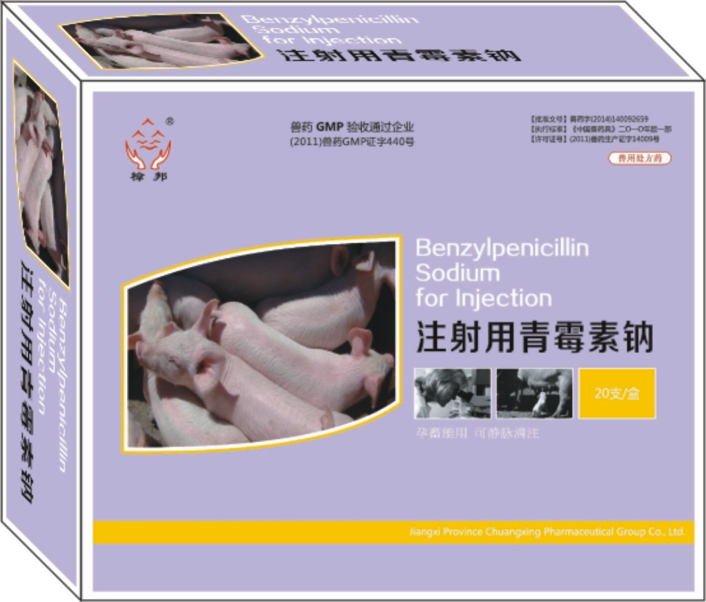 【兽药名称】 通用名称: 注射用青霉素钠 兽用处方药 英文名称: benzylpenicillin sodium for injection 汉语拼音: zhusheyong qingmeisuna 【主要成分】 青霉素钠 【性状】 本品为白色结晶性粉末。 【药理作用】 药效学 青霉素属杀菌性抗生素,抗菌活性强,其抗菌作用机理主要是抑制细菌细胞壁粘肽的合成。生长期的敏感菌分裂旺盛,细胞壁处于生物合成期,在青霉素的作用下,粘肽的合成受阻不能形成细胞壁,在渗透压作用下导致细胞膜破裂而死亡。非生长繁殖 期的细菌,此时不需合成细胞壁,则青霉素不起杀菌作用,不应将青霉素这类“繁殖期杀菌剂” 与抑制细菌生长繁殖的“快效抑菌剂”(如氟苯尼考、四环素类、红霉素等)合用。后者使细菌处于生长抑制状态,导致青霉素不能发挥作用。 青霉素为窄谱抗生素,主要对多种革兰氏阳性菌和少数革兰氏阴性菌有作用。主要敏感菌有葡萄球菌、链球菌、猪丹毒杆菌、棒状杆菌、破伤风梭菌、放线菌、炭疽杆菌、螺旋体等。 对分支杆菌、支原体、衣原体、立克次体、诺卡菌、真菌和病毒均不敏感。 药动学 青霉素钠盐肌内注射后吸收迅速,15~30分钟达血药峰浓度,肌内注射后血药 浓度维持0.5μg/ml以上的时间为6~7小时。青霉素可广泛分布到全身各组织,并可进入胎儿循环,以肾、肝、肺、肌肉、小肠和脾的浓度较高;骨骼、唾液和乳汁含量较低。在正常脑脊液中的浓度仅为血药浓度的1%~3%,炎症时脑脊液中浓度可达血药浓度的5%~30%。乳汁中青霉素的浓度可为血药浓度的5%~20%。乳室注入青霉素,最初几小时可大量吸收,乳中可维持抗菌浓度至相当长的时间。据报道,在乳室内注入10万单位青霉素水溶液,其在乳中可保留 4.26 单位/ml 至24小时。 青霉素小部分在肝内代谢,大部分以原形排泄。在肾功能正常情况下,50%~75%自肾脏排出,其中90%通过肾小管分泌,因排出迅速,故体内消除较快。青霉素的血浆蛋白结合率约50%。半衰期较短,种属间的差异较小,所有家畜的半衰期为0.5~1.2小时。表观分布容积也较小,一般为0.2~0.3 l/kg,血浆浓度较高,组织浓度较低。 【药物相互作用】 (1)青霉素与氨基糖苷类合用,可提高后者在菌体内的浓度,呈现协同作用。 (2)大环内酯类、四环素类和酰胺醇类等快效抑菌剂对青霉素的杀菌活性有干扰作用, 不宜合用。 (3)重金属离子(尤其是铜、锌、汞)、醇类、酸、碘、氧化剂、还原剂、羟基化合物, 呈酸性的葡萄糖注射液或盐酸四环素注射液等可破坏青霉素的活性,禁止配伍。 (4)胺类与青霉素可形成不溶性盐,可以延缓青霉素的吸收,如普鲁卡因青霉素。 (5)青霉素钠水溶液与一些药物溶液(如盐酸氯丙嗪、盐酸林可霉素、酒石酸去甲肾上腺素、盐酸土霉素、盐酸四环素、b 族维生素及维生素 c)不宜混合,否则可产生混浊、絮状物或沉淀。 【作用与用途】 β-内酰胺类抗生素。主要用于革兰氏阳性菌感染,亦用于放线菌及钩端螺旋体等的感染。 【用法与用量】 以青霉素钠计。肌内注射:一次量,每1kg体重,马、牛 1万~2万单位;羊、猪、驹、犊 2万~3万单位;犬、猫 3万~4万单位;禽 5万单位。一日2~3次,连 用2~3日。 临用前,加灭菌注射用水适量使溶解。 【不良反应】 (1)主要是过敏反应,大多数家畜均可发生,但发生率较低。局部反应表现 为注射部位水肿、疼痛,全身反应为荨麻疹、皮疹,严重者可引起休克或死亡。 (2)对某些动物,青霉素可诱导胃肠道的二重感染。 【注意事项】 (1)青霉素钠易溶于水,水溶液不稳定,很易水解,水解率随温度升高而加速,因此注射液应在临用前配制。必需保存时,应置冰箱中(2~8℃),可保存7天,在室温只能保存24小时。 (2)应了解与其他药物的相互作用和配伍禁忌,以免影响青霉素的药效。 (3)大剂量注射可能出现高钠血症。对肾功能减退或心功能不全患畜会产生不良后果。 (4)治疗破伤风时宜与破伤风抗毒素合用。 【休药期】 0日;弃奶期72小时。 【规格】 按 c16h17n2nao4s 计算2.4g(400万单位) 【包装】20支/盒 【贮藏】 密闭,在凉暗干燥处保存。