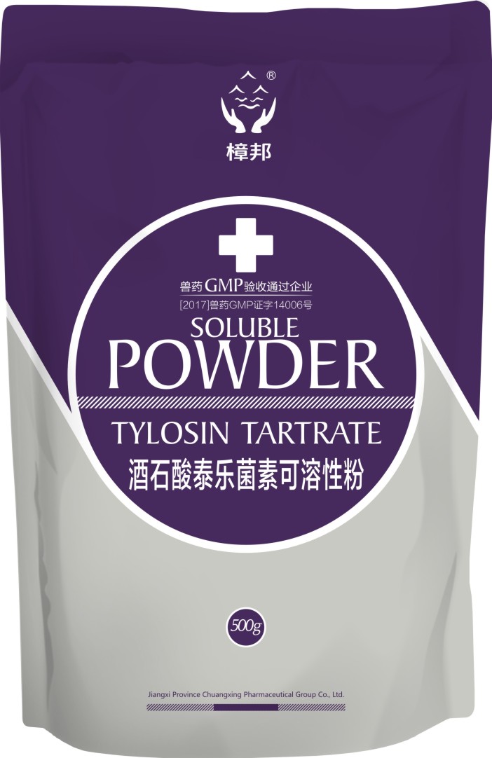 【兽药名称】通用名称:酒石酸泰乐菌素可溶性粉 兽用处方药 英文名称:tylosin tartrate soluble powder 汉语拼音:jiushisuan tailejunsu kerongxingfen 【主要成分】泰乐菌素 【性状】本品为白色至浅黄色粉末。 【药理作用】药效学泰乐菌素是动物专用大环内酯类抗生素,对支原体作用强。抗菌谱与红霉素相似,敏感的革兰氏阳性菌有金黄色葡萄球菌(包括耐青霉素金黄色葡萄球菌)、肺炎球菌、链球菌、碳疽杆菌、猪丹毒杆菌、李斯特菌、腐败梭菌、气肿疽梭菌等。敏感的革兰氏阴性菌有嗜血杆菌、脑膜炎双球菌、巴氏杆菌等。敏感菌对本品可产生耐药性,金黄色葡萄球菌对本品和红霉素有部分交叉耐药现象。 药动学 泰乐菌素内服后可从胃肠道吸收,猪内服后1小时即达血药峰浓度,磷酸泰乐菌素则较少被吸收。泰乐菌素吸收后在体内广泛分布,注射给药的脏器浓度比内服高2~3倍,但不易投入脑脊液。 【药物相互作用】⑴与其他大环内酯类、林可胺类和酰胺醇类因作用靶点相同,不宜同时使用。 ⑵与β-内酰胺类合用表现为拮抗作用。 【适应证】用于治疗鸡的支原体及敏感细菌感染,如鸡的慢性呼吸道和传染性鼻炎等。 【用法与用量】以本品计。混饮:每1l水,禽5g。连用3~5日。 【不良反应】⑴泰乐菌素可引起人接触性皮炎。 ⑵与其他大环内酯类一样,具有刺激性。 【注意事项】蛋鸡产蛋期禁用。 【休药期】鸡1日。 【规格】100g:10g(1000万单位) 【包装】500g 【贮藏】密闭,在干燥处保存。 |