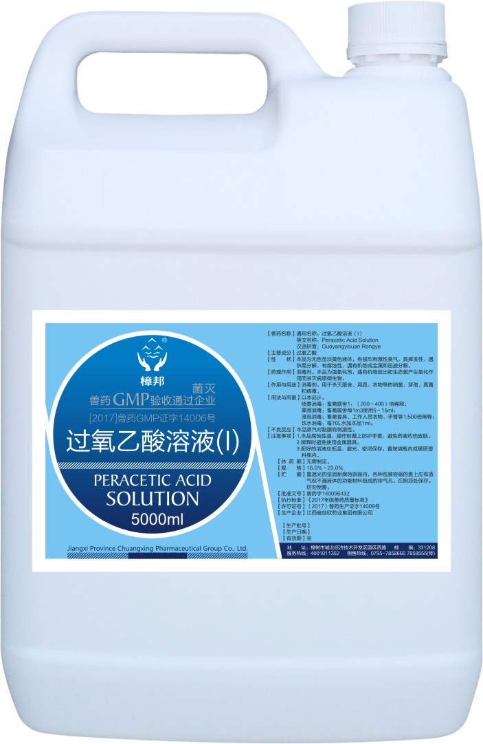 【兽药名称】通用名称:过氧乙酸溶液(i) 外用 兽用非处方药 英文名称:peracetic acid solution 汉语拼音:guoyangyisuan rongye 【主要成分】过氧乙酸 【性状】本品为无色至淡黄色液体,有强烈刺激性臭气,具挥发性,遇热易分解,有腐蚀性,遇有机物或金属即迅速分解。 【药理作用】消毒剂。本品为强氧化剂,遇有机物放出初生态氧产生氧化作用而杀灭病原微生物。 【作用与用途】消毒剂。用于杀灭厩舍、用具、衣物等的细菌、芽孢、真菌和病毒。 【用法与用量】以本品计。喷雾消毒:畜禽厩舍1:(200~400)倍稀释;熏蒸消毒:畜禽厩舍每1m3使用5~15ml;浸泡消毒:畜禽食具、工作人员衣物、手臂等1:500倍稀释;饮水消毒:每10l水加本品1ml。 【不良反应】本品蒸汽对黏膜有刺激性。 【注意事项】1.本品腐蚀性强,操作时戴上防护手套,避免药液灼伤皮肤。 2.稀释时避免使用金属器具。3.配好的溶液应低温、避光、密闭保存,置玻璃瓶内或硬质塑料瓶内。 【休药期】无需制定。 【规格】16.0%~23.0% 【贮藏】置遮光的坚固耐腐蚀容器内,各种包装容器的盖上应有透气但不漏液体的功能材料组成的排气孔。在阴凉处保存。切勿倒置。 |