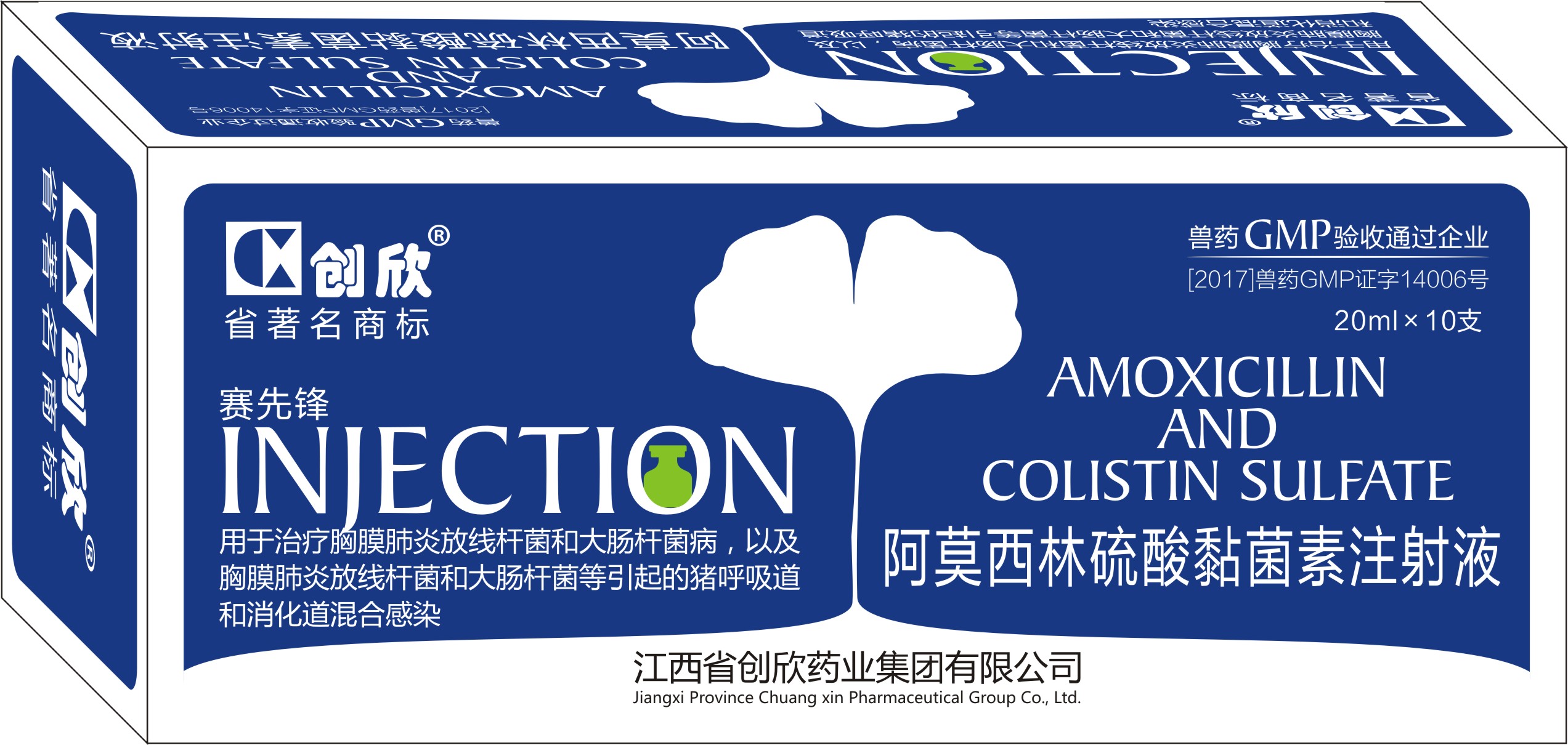 【兽药名称】通用名称:阿莫西林硫酸黏菌素注射液 兽用处方药 英文名称:amoxicillin and colistin sulfate injection 汉语拼音:amoxilin liusuannanjunsu zhusheye 【主要成分】阿莫西林、硫酸黏菌素 【性状】本品为类白色至淡黄色混悬液体;久置可分层,上层为无色液体,下层为类白色至淡黄色沉淀。 【药理作用】阿莫西林为半合成的广谱抗生素,通过与细菌细胞膜上的青霉素结合蛋白(pbp)结合而妨碍细菌细胞壁粘肽的合成,使之不能交联而造成细胞壁的缺损,致使细菌细胞破裂而死亡;对大多数革兰氏阳性菌和阴性菌均有较强的抗菌作用。 硫酸黏菌素为多肽类抗生素,对革兰氏阴性菌有强大的抗菌作用,敏感菌有大肠杆菌、沙门氏菌属、志贺氏菌属、巴氏杆菌属等; 两药联用后对胸膜肺炎放线杆菌、大肠杆菌等主要病原菌呈协同或相加作用为主。 【适应证】用于治疗胸膜肺炎放线杆菌和大肠杆菌病,以及胸膜肺炎放线杆菌和大肠杆菌等引起的猪呼吸道和消化道混合感染。 【用法与用量】肌内注射:一次量,猪每1kg体重,0.1~0.2ml,一日1次,连用3~5日。 【注意事项】1.本品使用前充分摇匀;不宜冷冻保存; 2.对青霉素类药物过敏的动物禁用本品; 3.有青霉素和头孢菌素类药物过敏史的工作人员禁止接触本品。 4.避免超剂量使用,当剂量大于推荐剂量的3倍量(0.6ml/kg体重)时,应慎重使用。 5.当一次注射体积超过6ml,宜分点注射。 【不良反应】1.本品因含硫酸黏菌素而具有肾毒性和神经毒性。 2.本品局部注射体积过大会引起疼痛增加、注射部位出现肌肉变性、水肿等。 【休药期】29日 【规格】20ml:阿莫西林2g与黏菌素0.17g(500万单位) 【包装】20ml×10支 【贮藏】遮光,密闭保存。 |