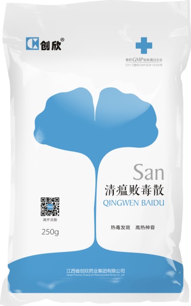 【兽药名称】通用名称:清瘟败毒散 兽用非处方药 汉语拼音:qingwen baidu san 【主要成分】石膏、地黄、水牛角、黄连、栀子等。 【性状】本品为灰黄色的粉末;气微香,味苦、微甜。 【功能】泻火解毒,凉血。 【主治】热毒发斑,高热神昏。 证见大热躁动,口渴,昏狂,发斑,舌绛,脉数。 【用法与用量】马、牛300~450g;羊、猪50~100g;兔、禽1~3g。 【不良反应】按规定剂量使用,暂未见不良反应。 【注意事项】暂无规定。 【规格】250g 【包装】250g/袋 【贮藏】密闭,防潮。 |